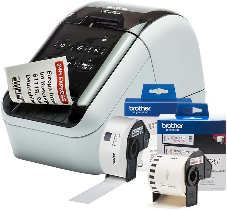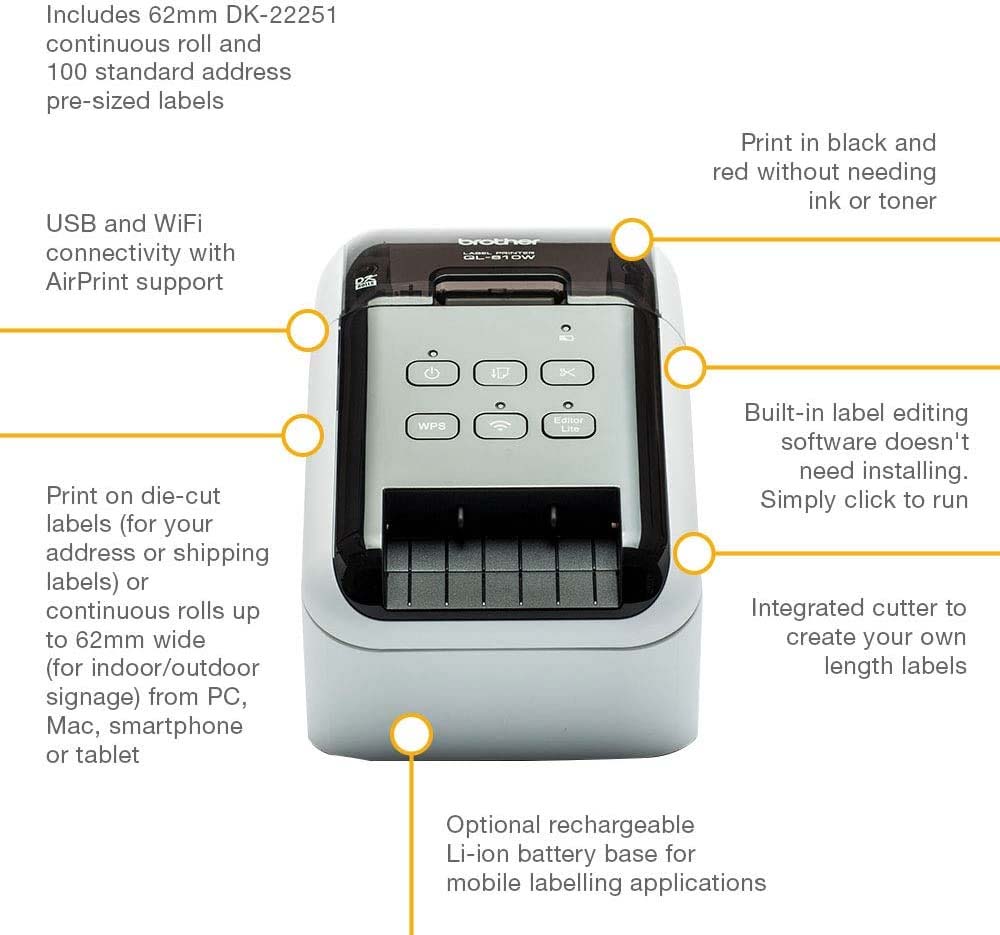 The Ultra-Fast Brother QL-810W label printer helps busy professionals easily tackle a variety of labeling tasks. With the Brother QL-810W ultra-fast label printer you can create amazing Black/Red labels using DK-2251 or cost-effective, paper labels for packages, envelopes, file folders, name badges, postage and more. Ultra-fast, printing up to 110 standard address labels per minute with black text at 300dpi.‡ The built-in Wireless interface offers easy connectivity – print from virtually anywhere or share on a network. With Brother’s network management tools it is easy to integrate and manage on any network. Create and print labels from your mobile device when connected to a wireless network via Air Print® and Brother iPrint &Label. Using the free, Brother iPrint & Label app‡ with your Apple® iPhone®, iPad®, and iPod touch® or Android™ smartphones you can quickly access and print label templates – or create your own custom labels with graphics or photos. Add an optional Li-ion battery for a complete mobile solution. Easy to integrate with free software development kits(Windows, iOS and Android™). Uses convenient, Brother genuine DK drop in labeling supplies. Needs no ink or toner. Windows and Mac® compatible